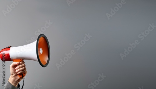 Hand holding a megaphone announces sales and discounts, on a vibrant background