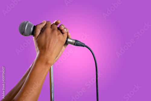 Hand holding a microphone on a stand.