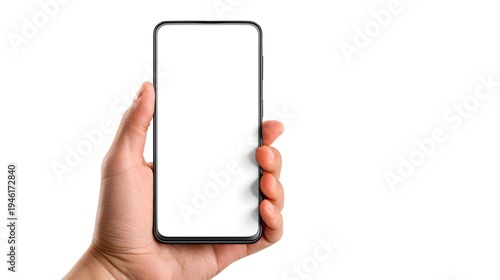 Hand Holding a Modern Smartphone with a Blank White Screen.
