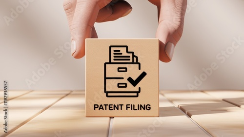 Hand Holding a Patent Filing Document on a Wooden Desk in an Office Workplace Environment Concept of Legal Business and Technological Innovation Processes Bureaucratic Corporate Growth Strategies