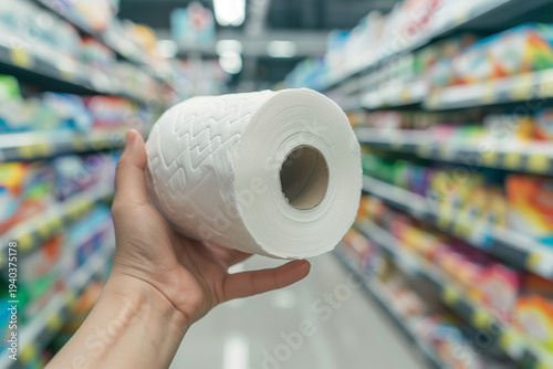 Hand holding a roll of paper towels in a supermarket aisle with shelves stocked with various household products in the background, cost of living and essential household item concept, space for text
