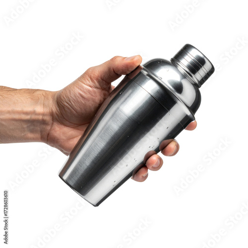 Hand Holding A Stainless Steel Cocktail Shaker With Water Droplets isolated on transparent background. PNG die-cut for advertising