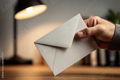 Hand holding a white envelope on a desk