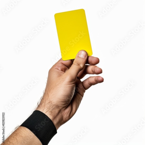 Hand holding a yellow card in soccer sports isolated on white with clipping path.