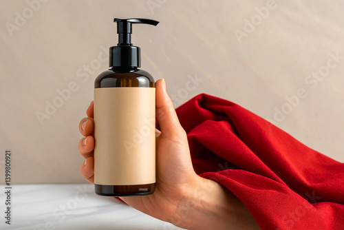 Hand Holding Amber Soap Dispenser with Blank Label