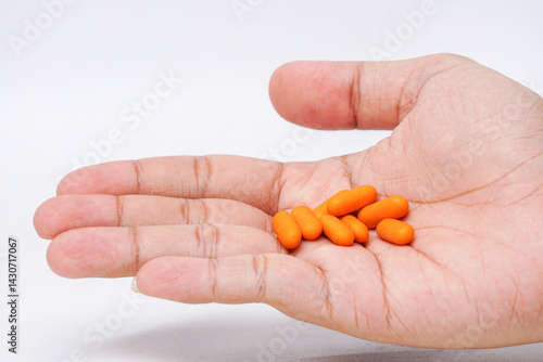 Hand holding an Orange Tablet Medicine on White Isolated Background