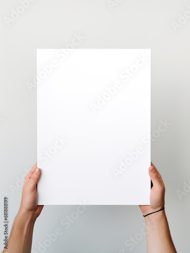 Hand holding blank photo frame board mockup on minimalist white background