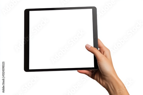 Hand holding blank tablet screen close up isolated on Transparent Background