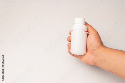 hand holding blank white squeeze bottle plastic tube on white background. Packaging for pill, capsule or supplement. Product branding