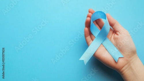 Hand holding blue ribbon on background, symbolizing prostate cancer awareness and support