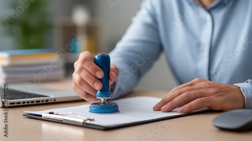 Hand holding blue stamp to approve official document on desk with laptop