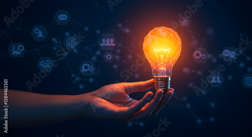 Hand Holding Bright Light Bulb with Glowing Network Connecting to Digital Icons on Dark Background