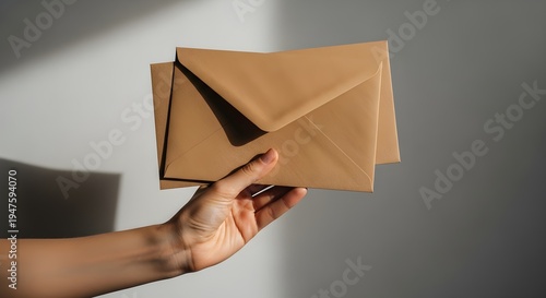 Hand holding brown envelopes, communication and correspondence concept, office supplies, mail
