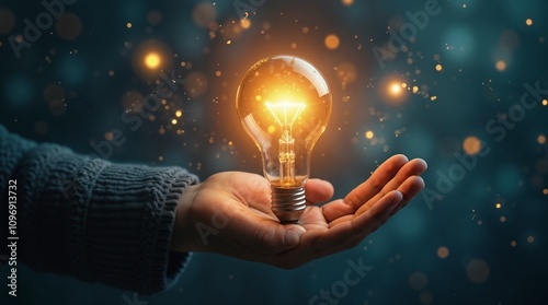 Hand holding digital light bulb network. New ideas and business innovation. Surrealism.