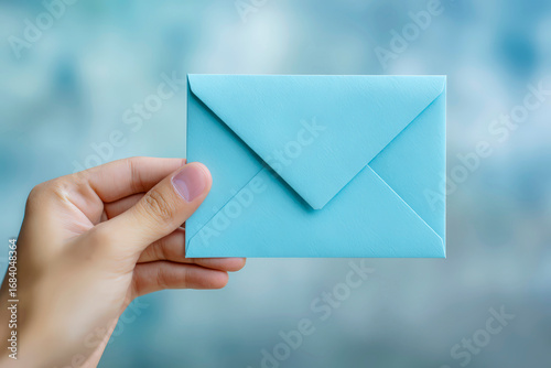 Hand Holding Light Blue Envelope Against Soft Blurred Background