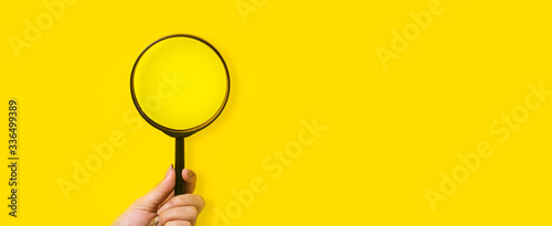 hand holding magnifier over yellow background, panoramic mock-up image with space for text