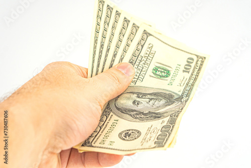 Hand holding money isolated on white background. One hundred Dollars bill on man hand to paying and giving.