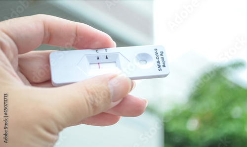 Hand Holding negative SARS-CoV-2 Rapid Antigen Test.COVID-19 rapid diagnostic test kit.COVID-19 test.corona virus test.delta covid.Lambda.