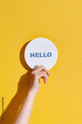Hand holding on a paper with the text Hello !