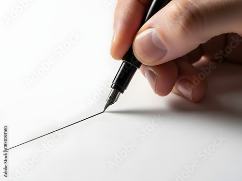 Hand holding pen writing line on white surface with copy space