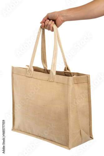 Hand holding sturdy eco-friendly tote bag, reusable shopping carryall isolated on transparent background