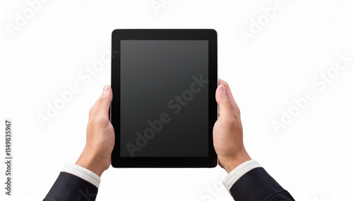 Hand holding tablet isolated - Hands holding black tablet isolated white background