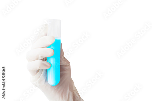 Hand holding test tube science with blue liquid isolated on white background - Clipping path