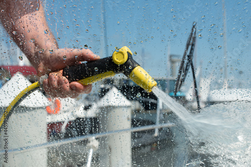 Hand holding water spray gun. Man washing boat with pressure water system.