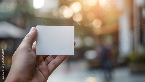 Hand holding white card mockup template, design presentation on blurred background. Business and modern technology concept