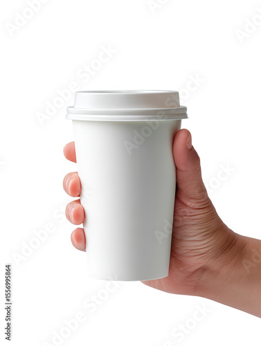 Hand Holding White Paper Coffee Cup with Lid Isolated