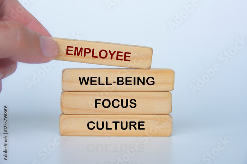 Hand holding wooden block with Employee Well Being Approach text. People first concept