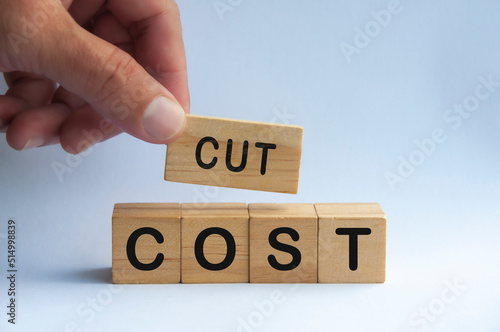 Hand holding wooden block with text - cut cost. Business concept