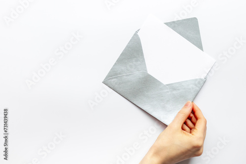 Hand holds blank paper against envelope for letters. Space for text, top view