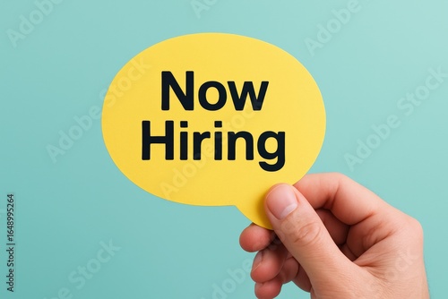 Hand holds bright yellow 'Now Hiring' sign against a teal background, signaling opportunity and a vibrant search for talent in today's market.