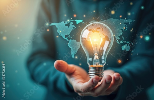 Hand holds light bulb with world map inside. Creative idea concept, innovation for global digital online business, marketing, data management services to target growth. Worldwide tech inspiration.