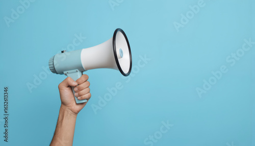 Hand holds megaphone on blue background. Person shouts loud message. Communication, leadership, announcement concept. Businesswoman businessman use for public speaking, presentation, marketing.