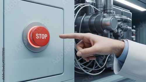 Hand in lab coat ready to press a bright red emergency stop button on a machine control panel