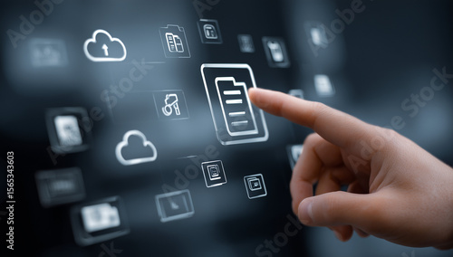 Hand Interacting with Cloud Computing and Data Security Icons
