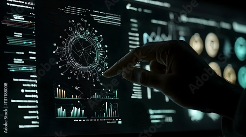 Hand interacting with futuristic data visualization on a dark screen. Image depicts advanced technology, data analysis, and digital interface.