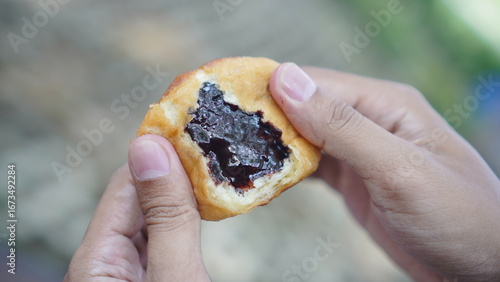 Hand is Holding a Fried Donut Filled with Sweet Chocolate Jam