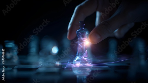 Hand is moving a clear chess pawn piece on a dark surface with a glowing, interconnected network pattern. Digital Knight Chess pieces board glowing, blue wireframe models.