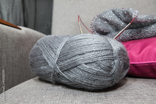 Hand knitting lying on an armchair.