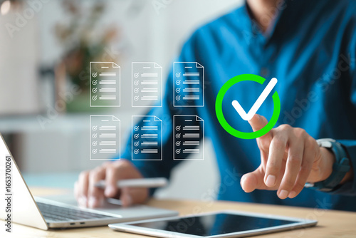 Hand of businessman pointing to document and mark correct sign for Certification Assurance Guarantee, ISO certification and standardization concept.