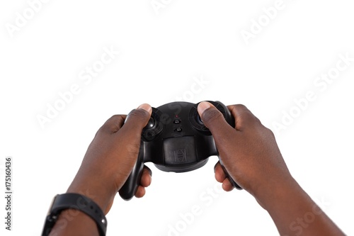 Hand of man playing video game against white background