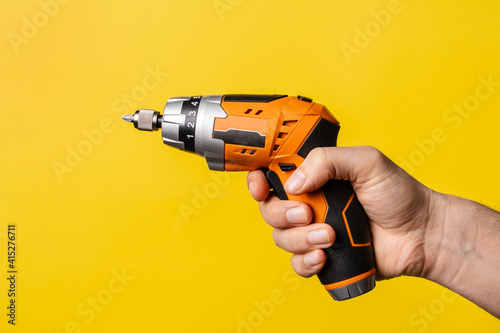 Hand of unknown man holding electric screwdriver - male hold work craft tool on bright yellow background - repair renovation electric equipment tools modern concept
