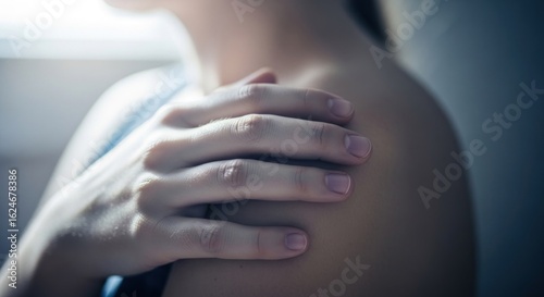 Hand on shoulder, soft focus. Pale skin, muted tones, delicate touch