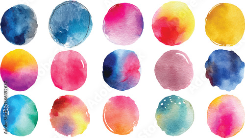 Hand painted watercolor colorful circle stains and drops set on transparent background, Paint Brush Strokes collection,