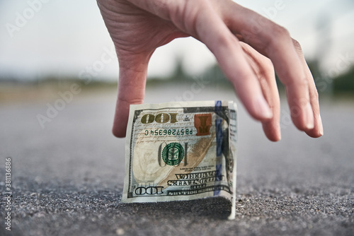 Hand pick one hundred dollar banknote from ground. Found money concept