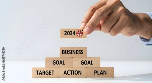 Hand placing a block with the year 2034 and a target on top of a pyramid of business terms