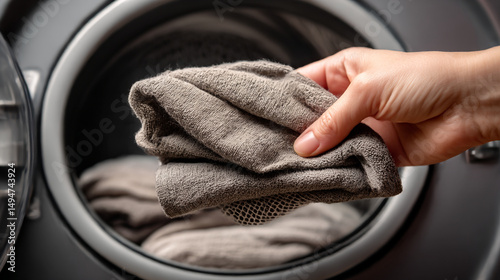 Hand placing folded gray towels into a front loading washing machine for a laundry cycle at home